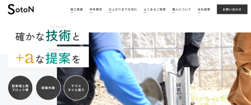 | 特徴・サービス | 外構・エクステリアは日々の暮らしに直結する大切な空間。SotoNでは、お客様のライフスタイルに寄り添い、「長く快適に使える外構」をご提案しています。耐久性やメンテナンス性なども丁寧にご説明し、後悔のない選択をサポート。タイルはタイル職人、植栽は植木職人といった分業体制により、専門性の高い美しい仕上がりを実現します。見た目だけでなく、機能性や安全性にも配慮したデザインと施工で、暮らしをより豊かに彩ります。 |